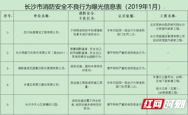 紅網(wǎng)時刻2月15日訊(記者 汪衡)今日,長沙消防支隊曝光了2019年1月存在消防安全不良行為的單位,分別是四川燦雄建設工程有限公司、長沙錢都文化娛樂有限公司(堂會KTV)、湖南皇家花園餐飲娛樂管理有限公司、中建五局第三建設有限公司、長沙市天心區(qū)披塘幼兒園等5家單位。